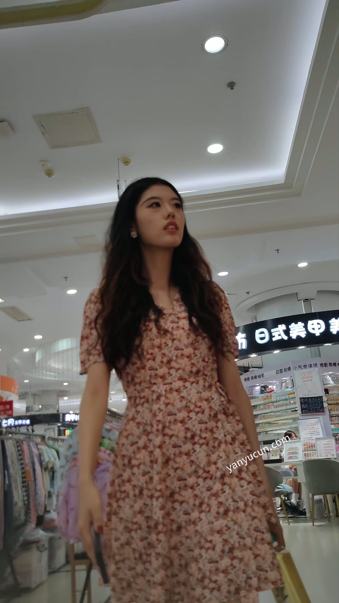 XM408粉色印花连衣裙身材极品小姐姐,白色内内