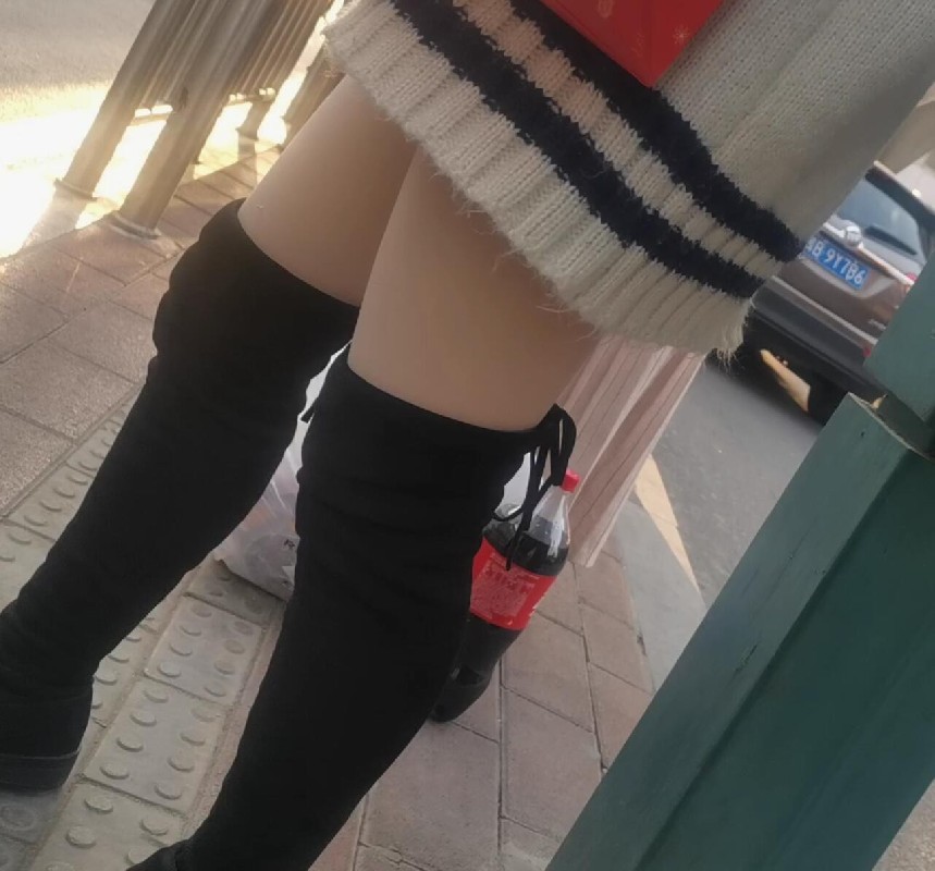 街拍站台白色毛衣肉丝长靴