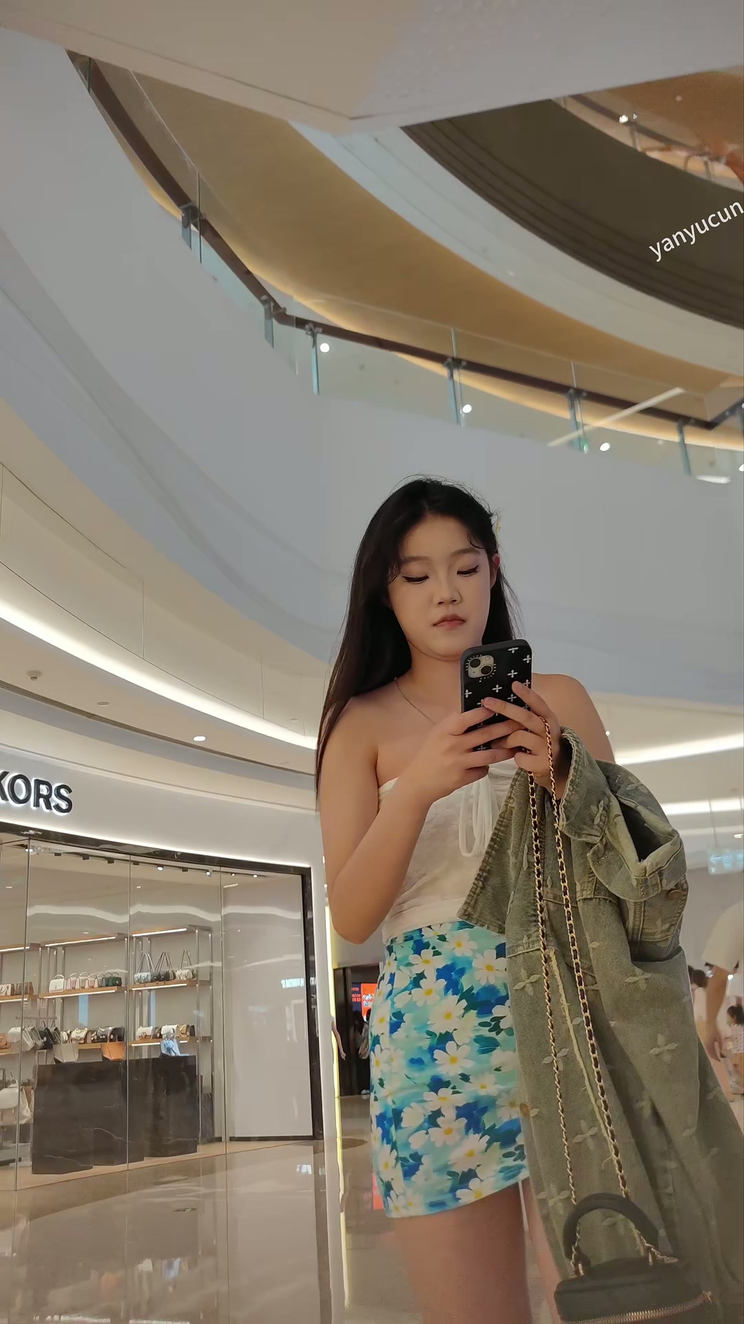 XM364蓝色印花超短裙小姐姐和闺蜜逛街,白色内内 364