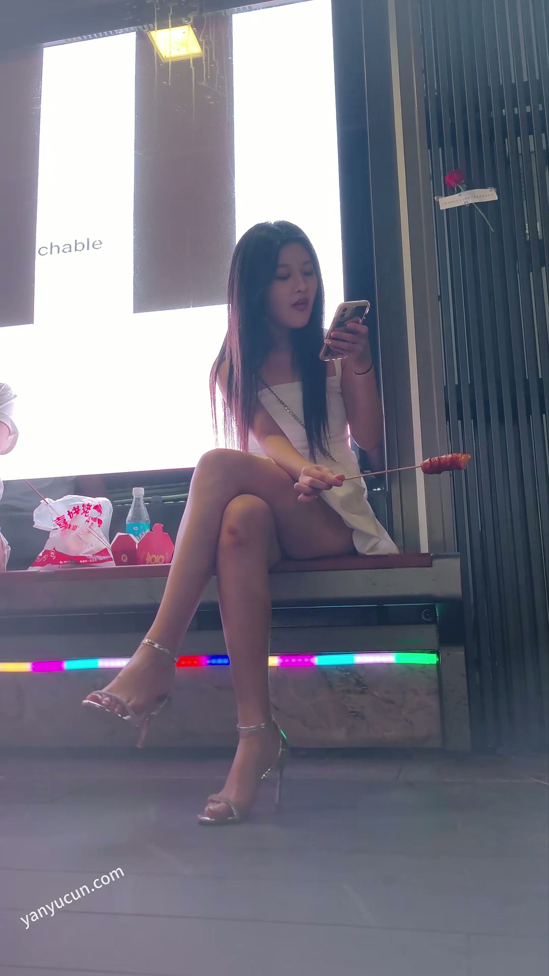 XM377白色连衣裙小姐姐坐着吃东西,粉色一次性内内 ...