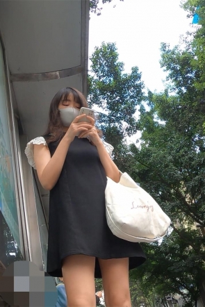 kc666黑短裙口罩小姐姐车站等车,米白干净NN